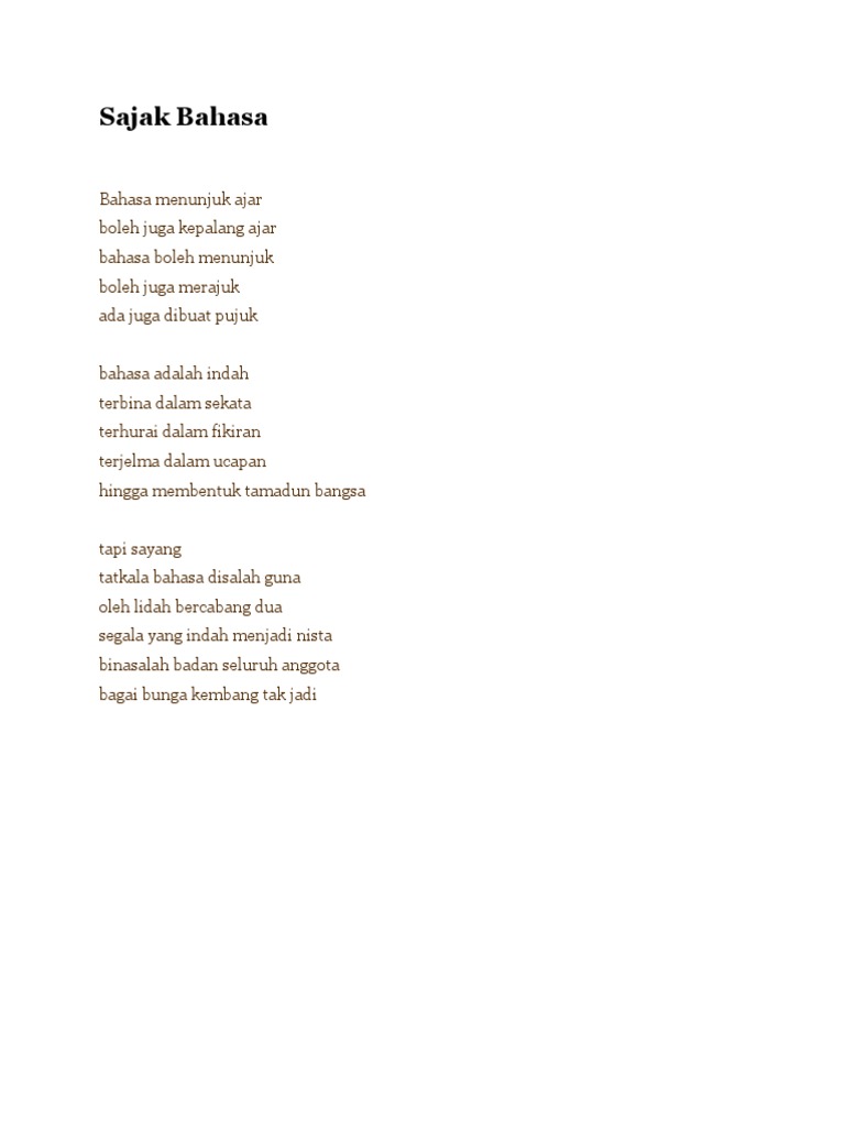 Misalnya sesebuah sajak akan menyelitkan persoalan kasih sayang kemarahan dan kekecewaan dalam sajak. Contoh Sajak Bahasa Melayu - Sajak Minggu Bahasa Pdf. Selamat datang ke blog Anjung Puisi.